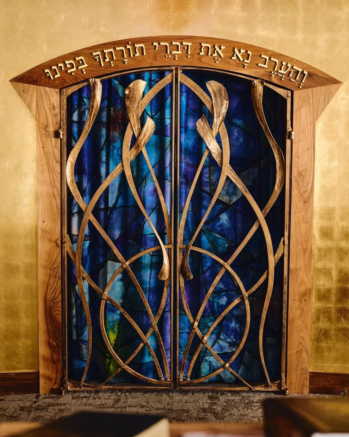 The Synagogue Ark and its surrounding gate went through several iterations. The design contains multiple layers, including doors, gates, and a curtain, each with symbolic and functional significance. Alicia looked to the work of Marc Chagall for inspiration, particularly in developing the curtain within the ark. His use of color and symbolism helped guide a softer, more expressive approach. Throughout this process, she leaned on Robert to help balance masculine and feminine qualities within the design.